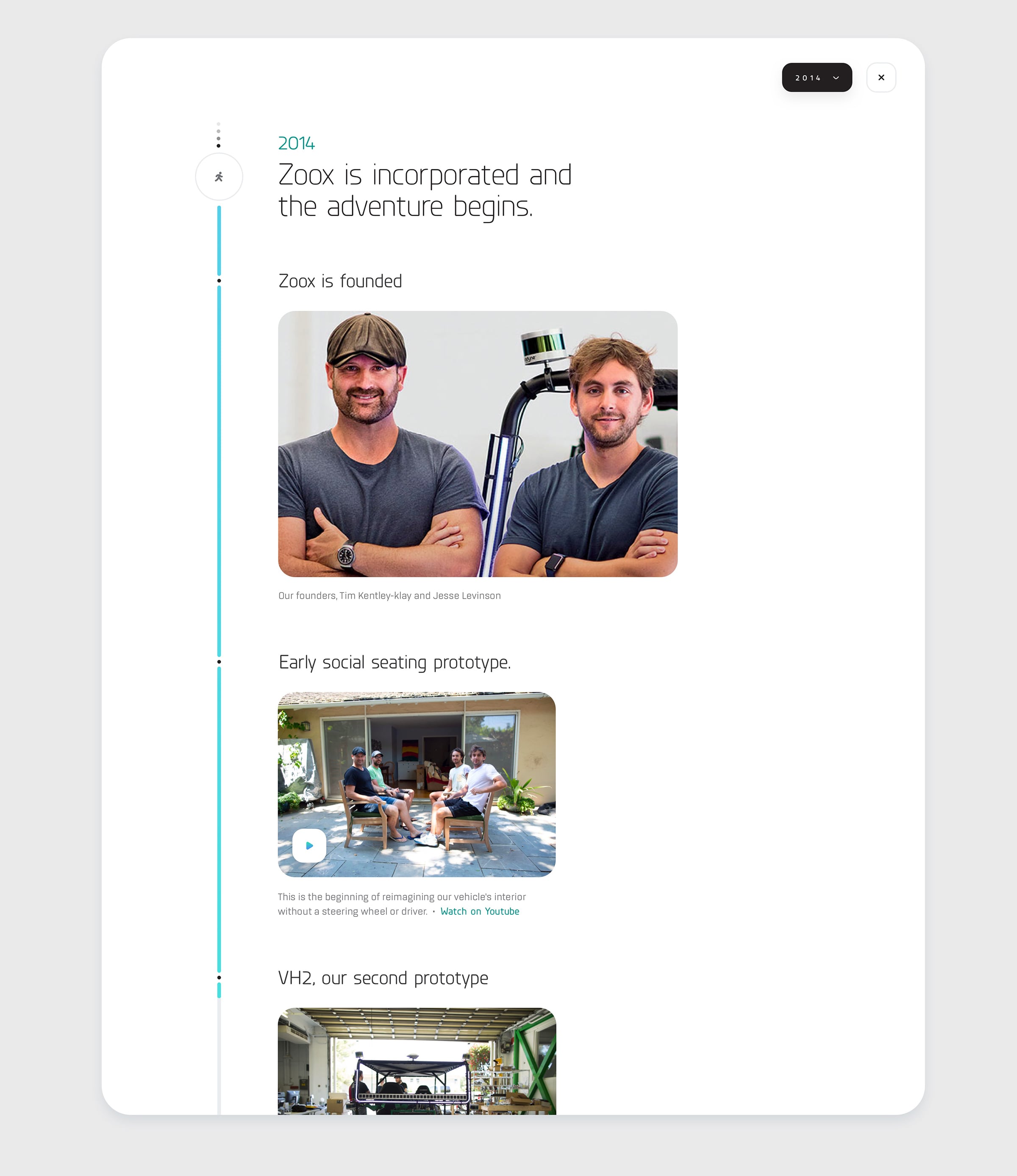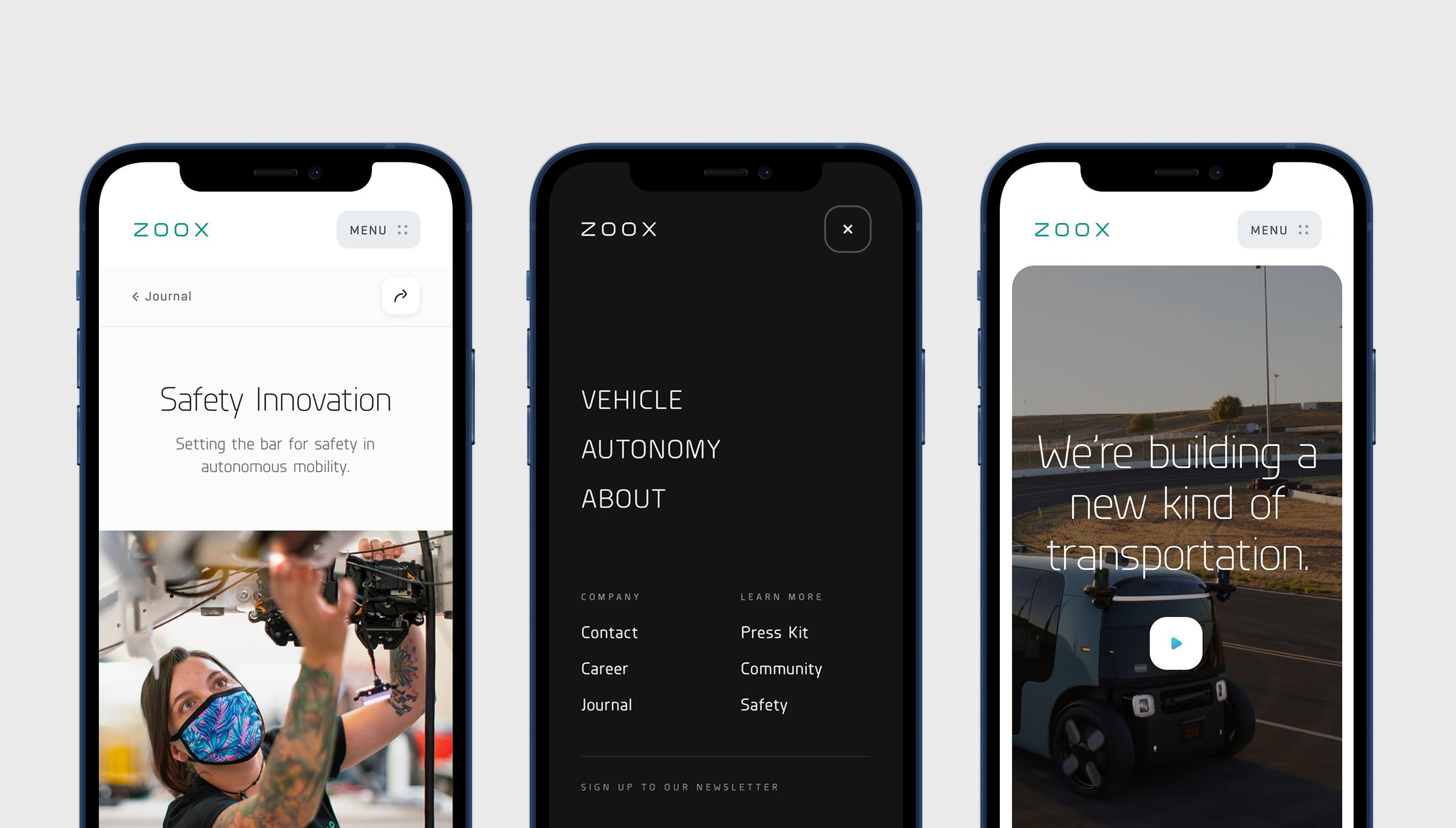 The website was the centerpiece of Zoox’s strategic marketing and PR plan to reveal its vehicle after 5 years of working in complete stealth mode. Knowing this, we created a dedicated press room. Publications could get everything they needed in one spot, and as a result, the press coverage was swift and extensive. There were over 500 articles written about Zoox in the two after the launch including articles on New York Times,  Fast Company, and Boomberg.
