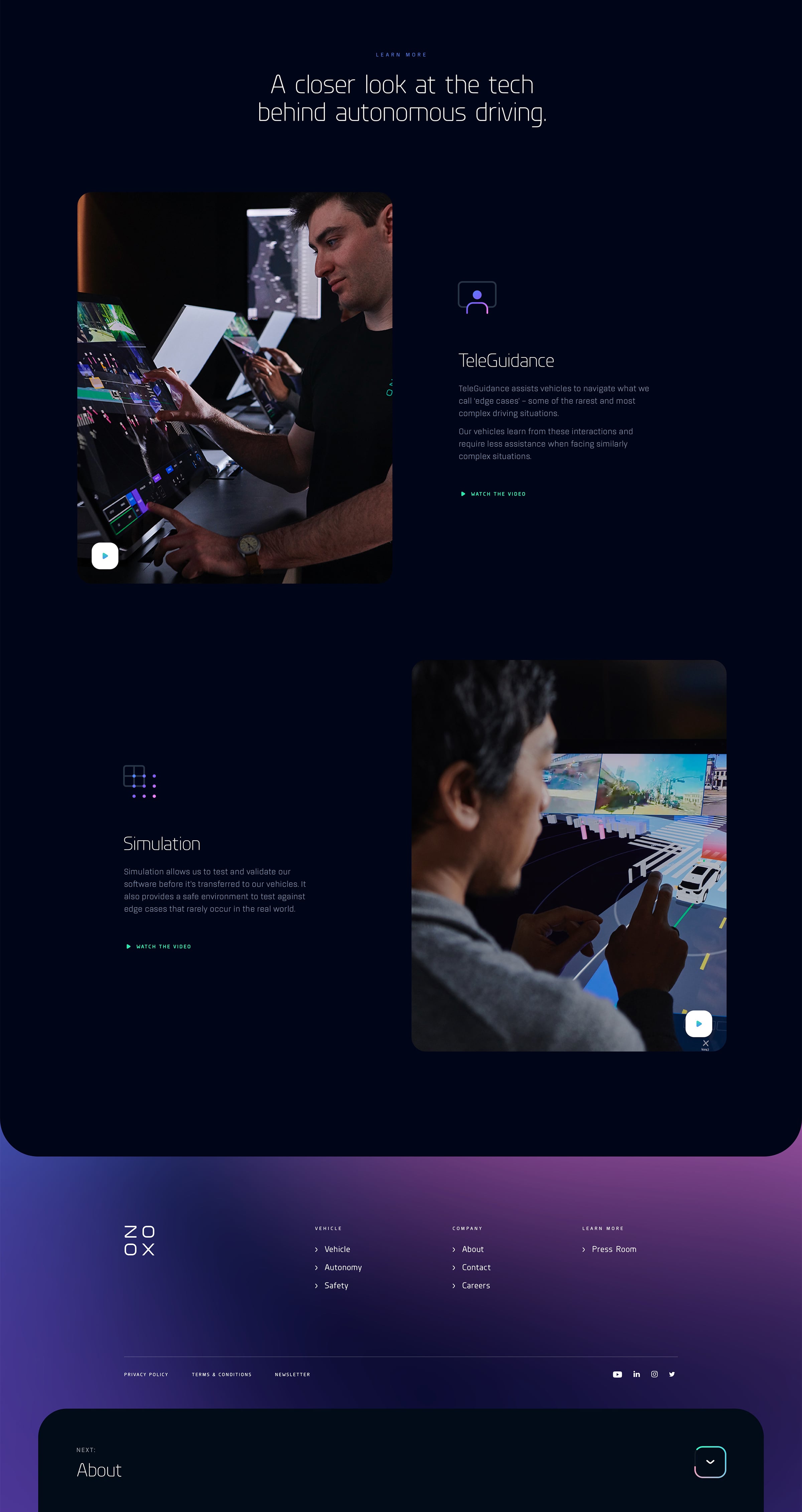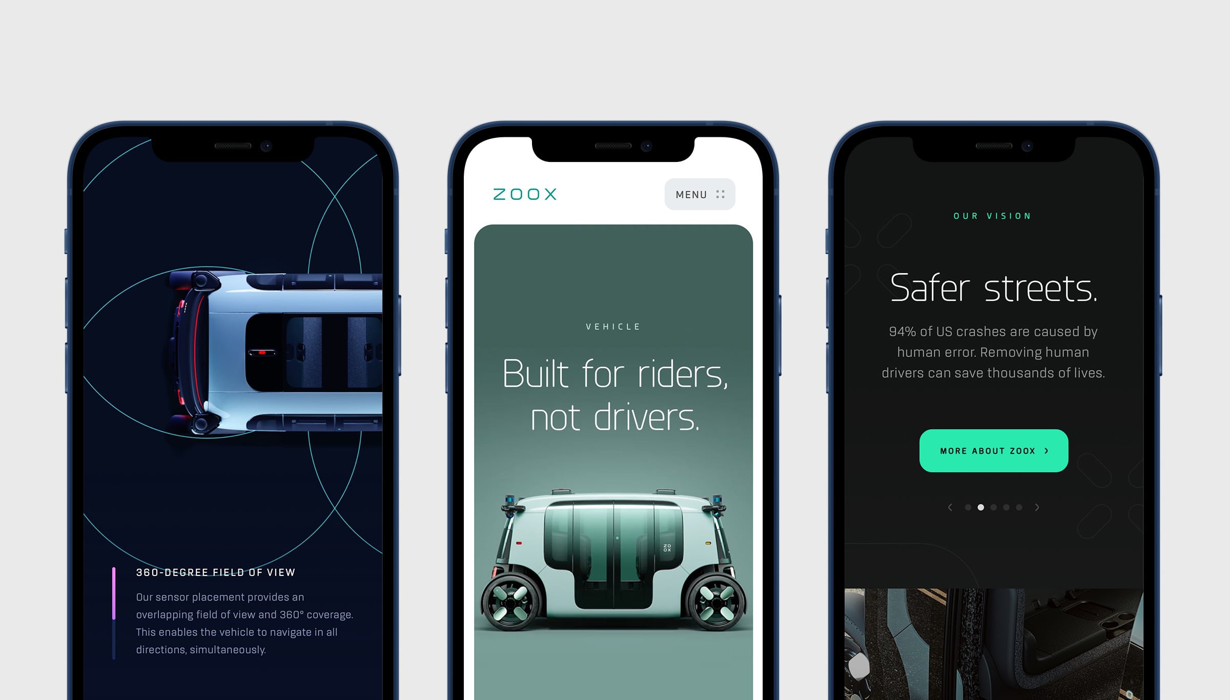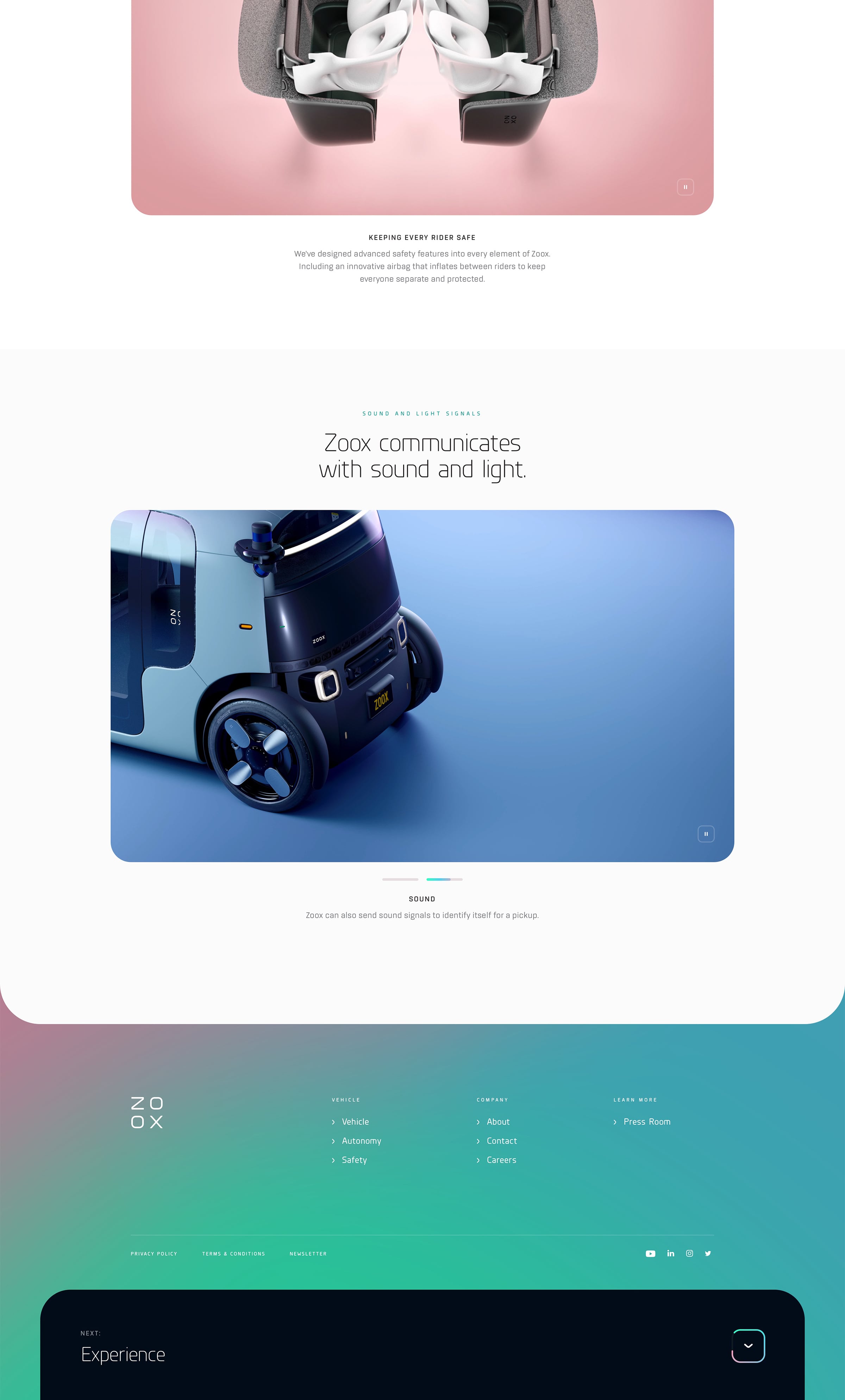 Zoox is an autonomous vehicle company headquartered in Foster City, California. In order to educate the public about their built from the ground-up robotaxi, we created for Zoox an immersive, scroll-enabled .com. The website earned a number of industry accolades – including the Webby for “Best Visual Design - Functionality” – in 2021.